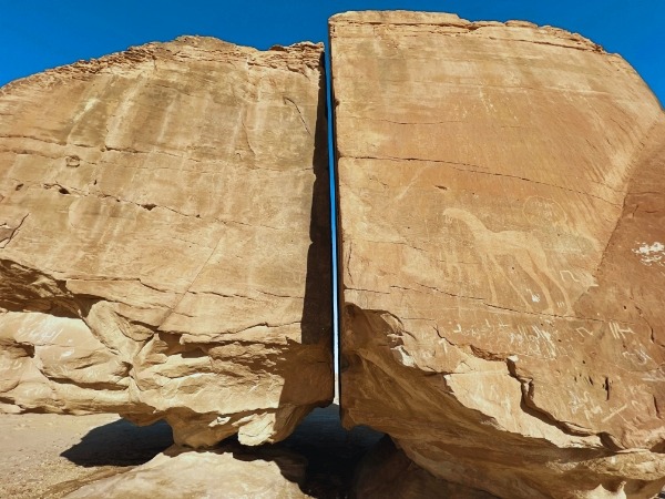 The Al Naslaa Rock Formation near Tayma is one of the most mysterious Saudi Arabia rock formations. Standing about 6 metres high and 9 metres wide, this sandstone formation is split perfectly down the middle, as if cut by a laser. The two halves rest on small pedestals. The split may have been caused by plate movements or weathering. Despite its strange precision, it is entirely natural.