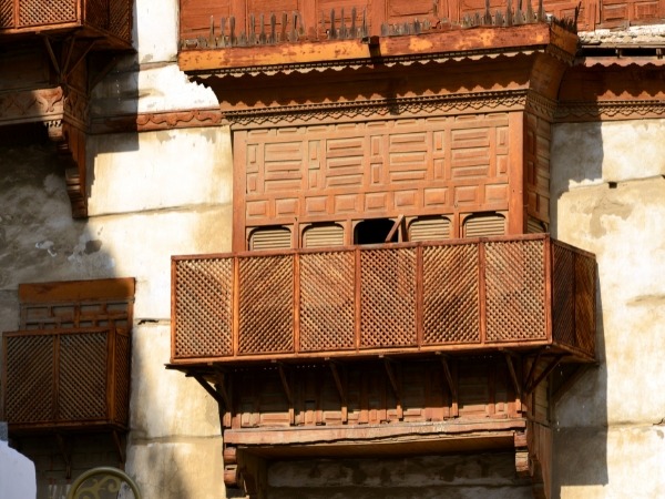 One of the most distinctive features of Al Balad is the rawasheen, also known as mashrabiya. These are the wooden window screens that project outward from the walls of traditional homes. They are usually made of teak wood and are carefully carved with artistic patterns. Rawasheen are not only beautiful; they also serve an important function by allowing air to move through the rooms and keeping houses cool during the hot summer months. Women could look outside without being seen, adding privacy while still letting them observe the street.